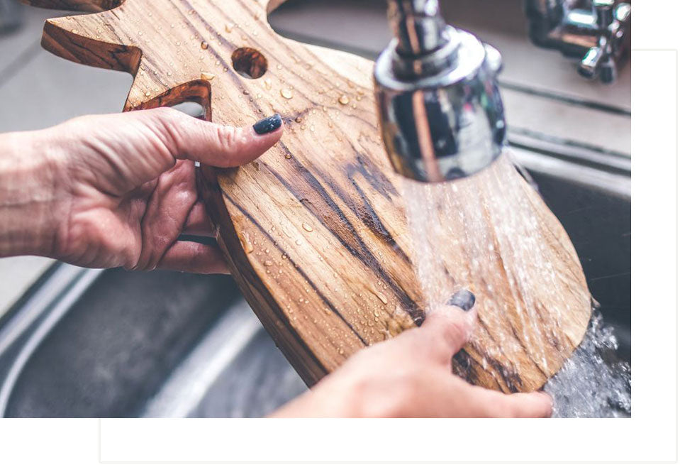 To avoid bacteria, it's important that you wash your cutting board immediately after use. Wipe the cutting board with hot soapy water, rinse it with hot water only and wipe it dry with a clean dish towel. Store in a dry area.